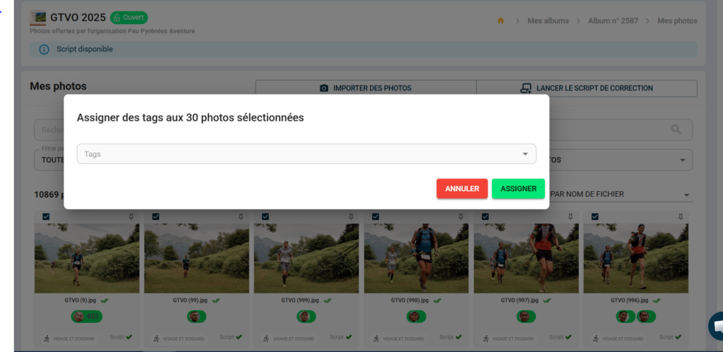 4. Une fenêtre s’ouvre — « Assigner des tags aux X photos sélectionnées »