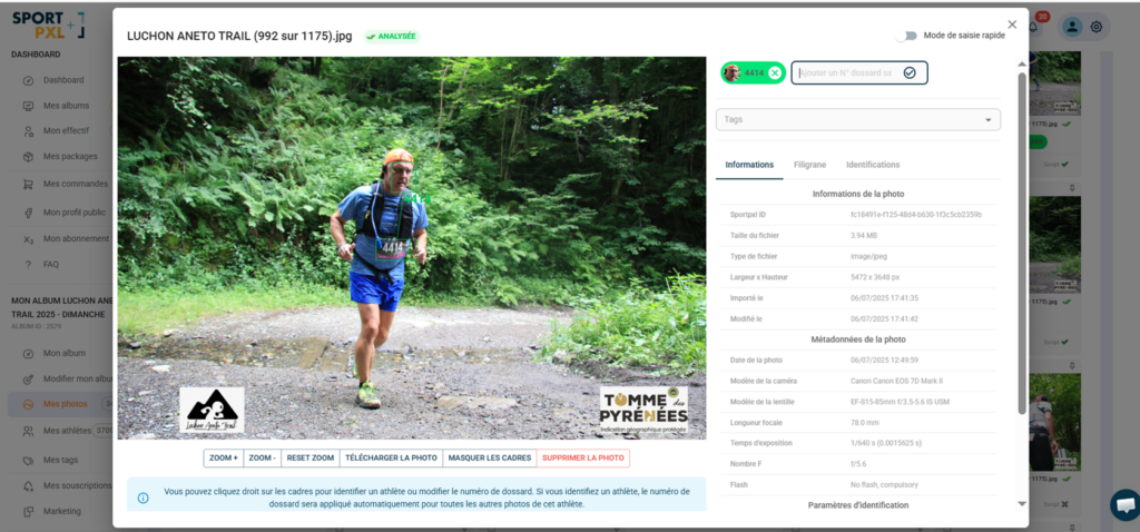 Une photo peut contenir plusieurs identifications (ex. : deux coureurs dans le cadre). Un athlète peut être identifié sur des dizaines ou des centaines de photos dans un même album.