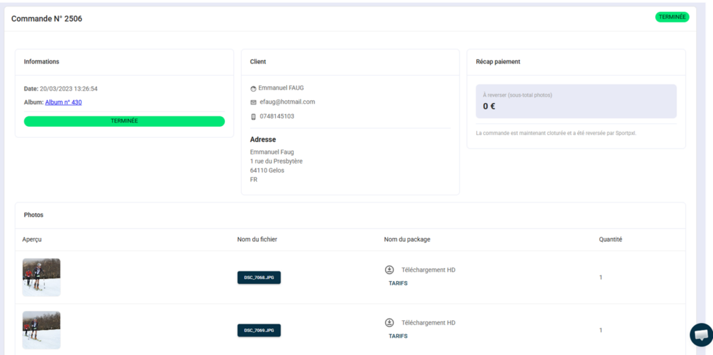 - Nom du package — le package acheté par le client (ex. : Téléchargement HD, Tirage 20×30…)