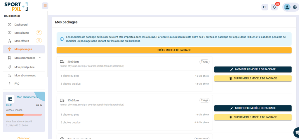 ⚠️ Les modèles et les packages d’un album sont indépendants. Modifier ou supprimer un modèle n’a aucun impact sur les albums qui l’utilisent déjà — le package a été copié dans l’album au moment de l’import.