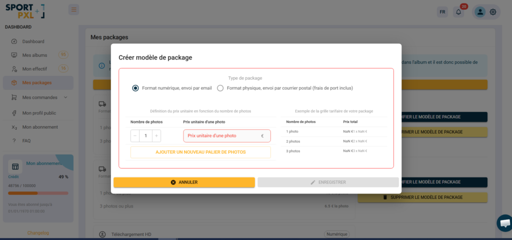 Les modèles de packages vous permettent de sauvegarder vos configurations tarifaires pour les réutiliser rapidement sur vos prochains albums, sans avoir à tout recréer à chaque fois.