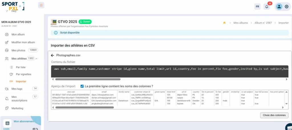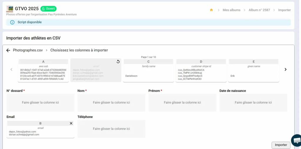 L’import CSV permet d’associer en masse les coordonnées des participants (nom, prénom, email) à leurs numéros de dossard, sans saisie manuelle. C’est l’étape clé pour pouvoir diffuser les photos par email à l’ensemble des participants.