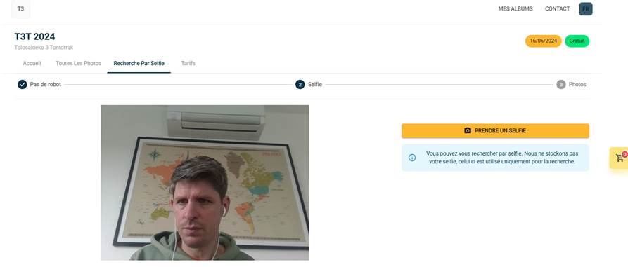 💡 La recherche par selfie nécessite que la reconnaissance faciale ait été activée sur l’album. Si l’album fonctionne uniquement en reconnaissance de dossard, cet onglet peut être masqué.