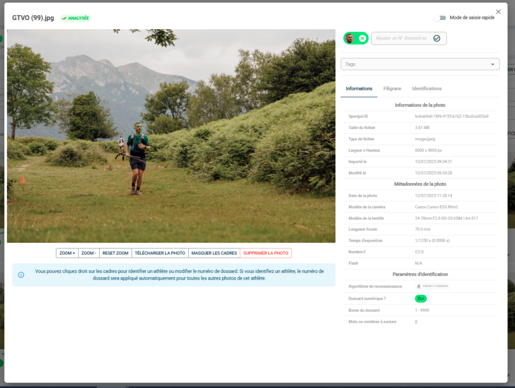 💡 To delete all photos from a specific bib number, first search for that bib number in the search bar — all its photos will be displayed. Select them and then delete them all at once. The same logic applies to tags or identification statuses.