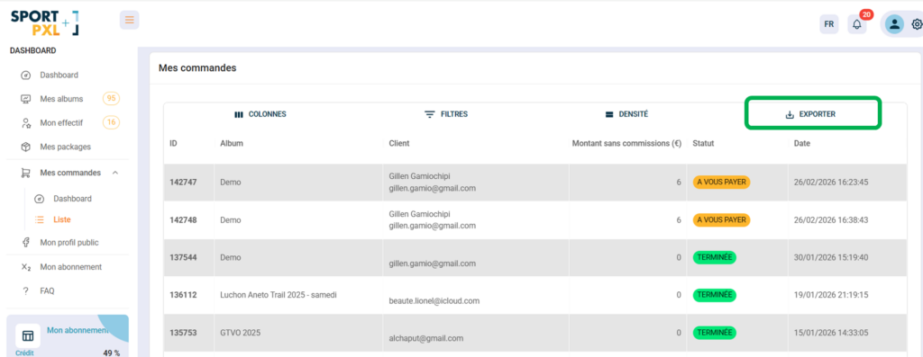 - If necessary, apply filters to export only a selection of orders (by status, album, date, etc.).