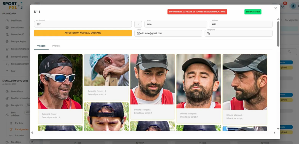 • Click on a thumbnail to open the athlete's file and assign a name, correct the bib number or view all their photos.